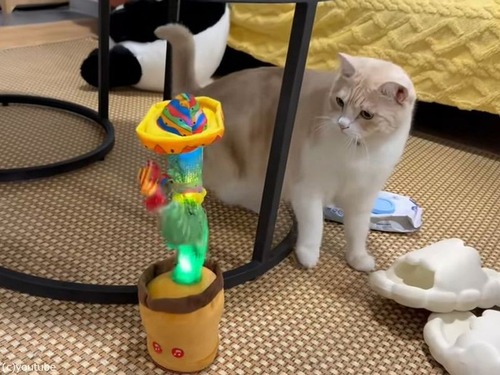 猫が…踊るサボテンのおもちゃに「ビクッ」と反応し続ける(動画)